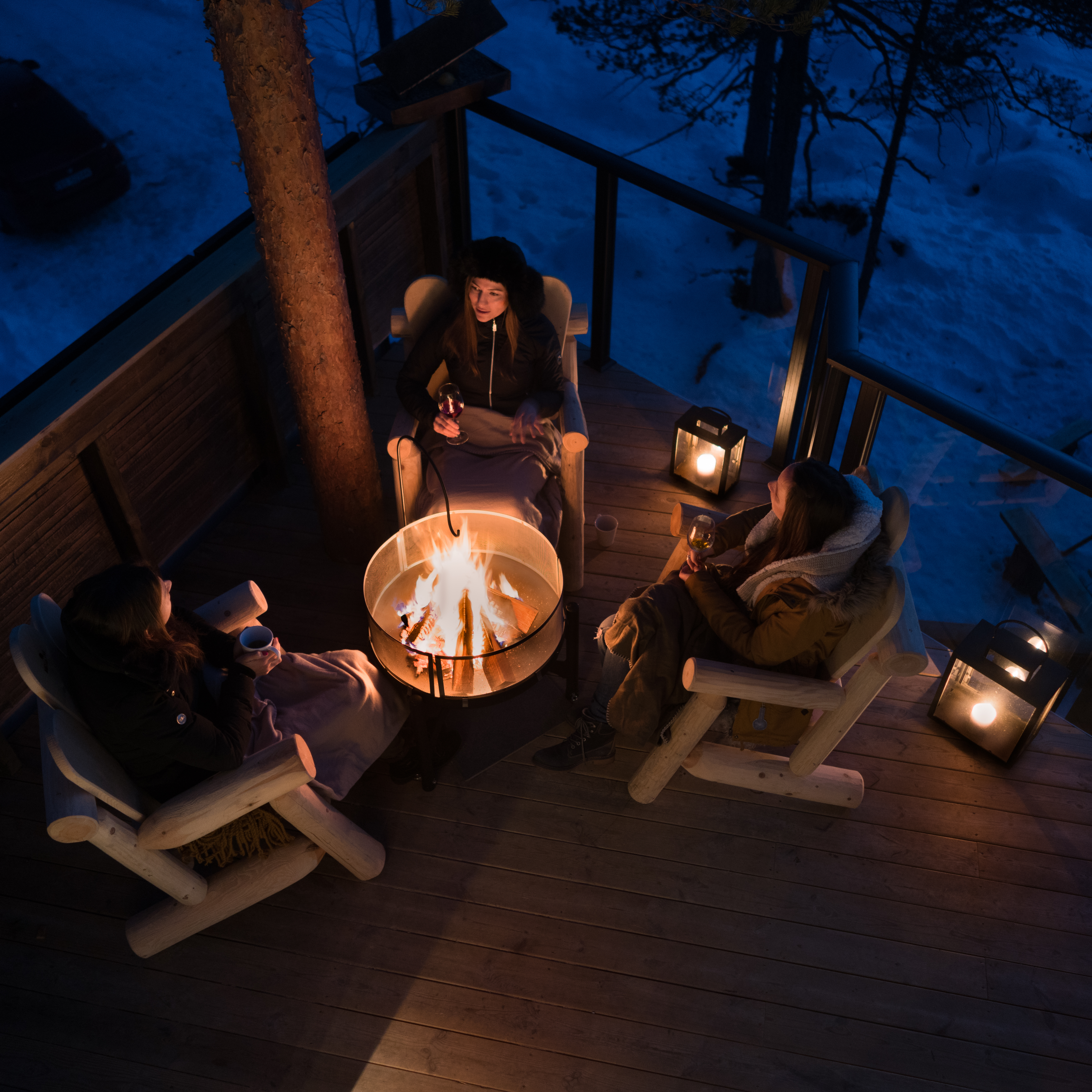 The cozy porch is fitted with robust wooden chairs, a fire pan for cooking, or for a cozy and warm campfire. The panoramic view over the waterfall, mountains, and surrounding forrest is simply wonderful!